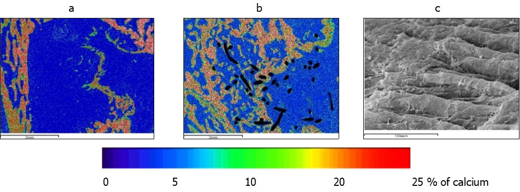Figure 3.The metaphyseal defect filling 30 days after surgery in the control (а) and experimental (b, c) group of animals, a, b – charts of x-ray electron probe microanalysis, images in calcium characteristic x-ray emission, magnification × 20; c – scanning electron microscopy, magnification × 500