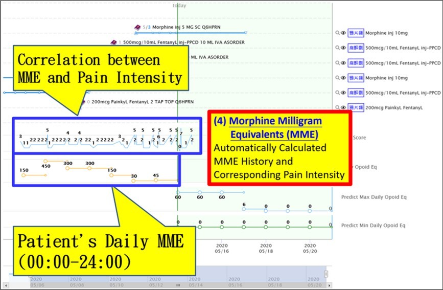In the past, many systems were only able to check medications at single or multiple time points, but they could not provide the equivalent dose at a glance. For example, there are various types of opioid-like medications, and each type has a different strength, typically represented in terms of Morphine Milligram Equivalents (MME) for oral morphine equivalence 8. For any given medication, different routes of administration and formulations may have varying oral morphine equivalents 9. Moreover, medications can be given in fractions or varying doses, such as half a tablet, half a syringe, or a quarter of a syringe. A patient may receive multiple different medications simultaneously, and each doctor may have a different perspective on the weighting of these medications 10. As a result, calculating the daily oral morphine equivalent dose can be challenging.
