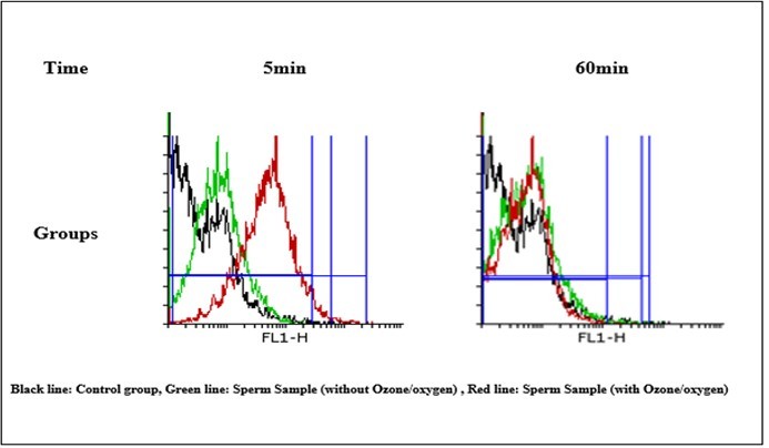 The mitochondrial ROS measurement was performed by flow cytometry using DCFH-DA. Briefly, isolated sperm mitochondria were incubated with, Ozone/ oxygen (5μg/ml) in respiration buffer. In the interval times of 5 and 60 min following the Ozone oxygen addition, a sample was taken and DCFH-DA was added (final concentration, 10 μm) to mitochondria and was then incubated for 10 min. O2/O3 prevented ROS generation in isolated sperm mitochondria were determined through the flow cytometry (BD) equipped with a 488-nm argon ion laser and supplied with the softwaring 1.2.5 and the signals were obtained using a 530-nm band pass filter (FL-1 channel). Each determination is based on the mean fluorescence intensity of 10,000 counts 7